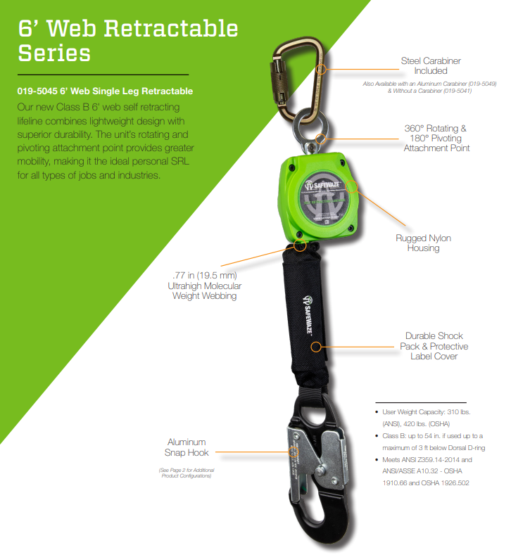 The SAFEWAZE 019-5049 Class A 6 ft web self-retracting lifeline with an aluminum snap hook combines lightweight design with durability. The unit comes with an aluminum carabiner and has a rotating and pivoting attachment point for improved mobility, making it the ideal personal retractable.