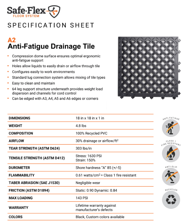 Ergo Advantage Safe-Flex interlocking mats have two male and two female sides to connect tiles to fit the space. Standardized connections allow different tile types (antifatigue and drainage) to be connected in the same configuration. The bottom of the tile is raised to allow cords to run under the tile. These mats are Class 1 fire rated.
