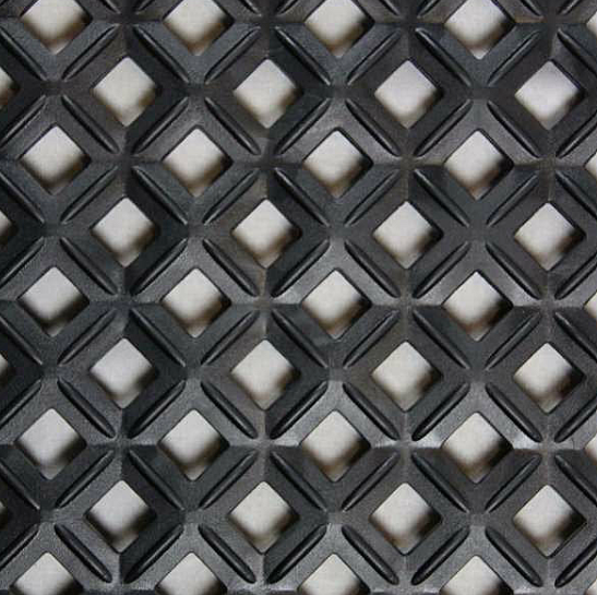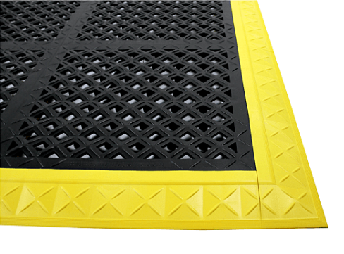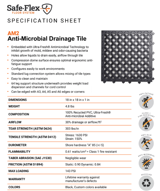 Ergo Advantage Safe-Flex interlocking mats have two male and two female sides to connect tiles to fit the space. Standardized connections allow different tile types (antifatigue and drainage) to be connected in the same configuration. The bottom of the tile is raised to allow cords to run under the tile. These mats are Class 1 fire rated.