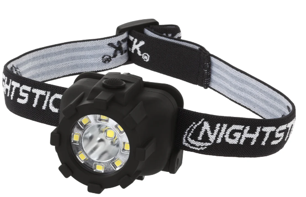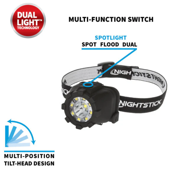 The NSP-4604B Dual-Light Headlamp features a multi-position tilt head design and has a tight-beam long-throw spotlight designed for distance illumination combined with a wide-beam close area floodlight. This product features a single top-mounted switch that activates a 100 lumens spotlight mode, a 45 lumens floodlight mode, and a 90 lumens Dual-Light mode that turns on both the spotlight and floodlight at the same time. Power comes from 3 AAA batteries (included).